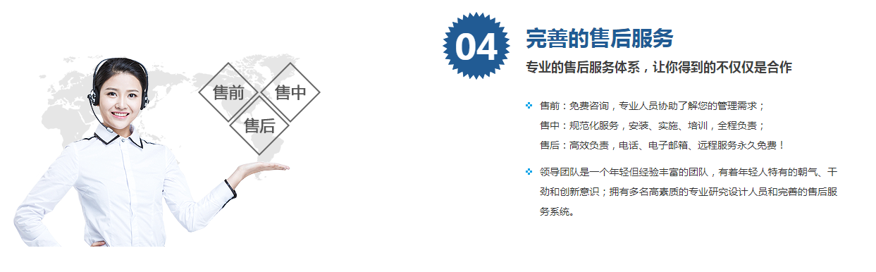 1、公(gōng)司配備完善(shàn)的客服隊伍(wǔ),提供全面的(de)售後服務,解(jiě)除客戶的一(yi)切後顧之憂(you)。