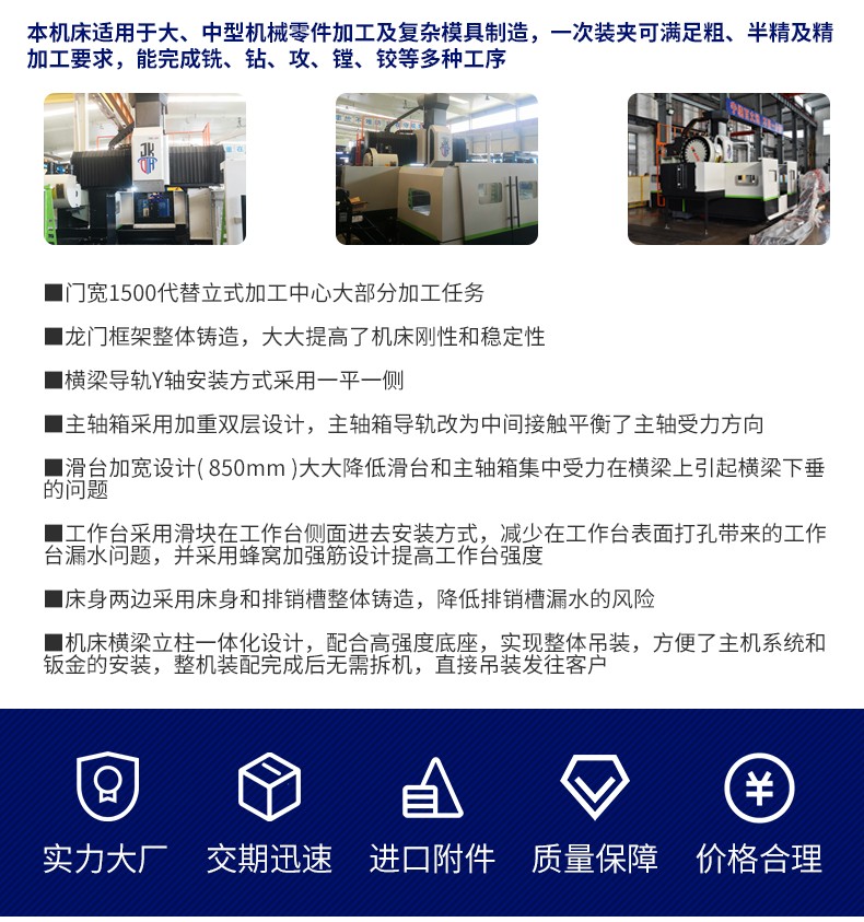 2、龍門框架(jià)整體鑄造(zào),大大提高(gāo)了機床剛(gang)性和穩定(ding)性。